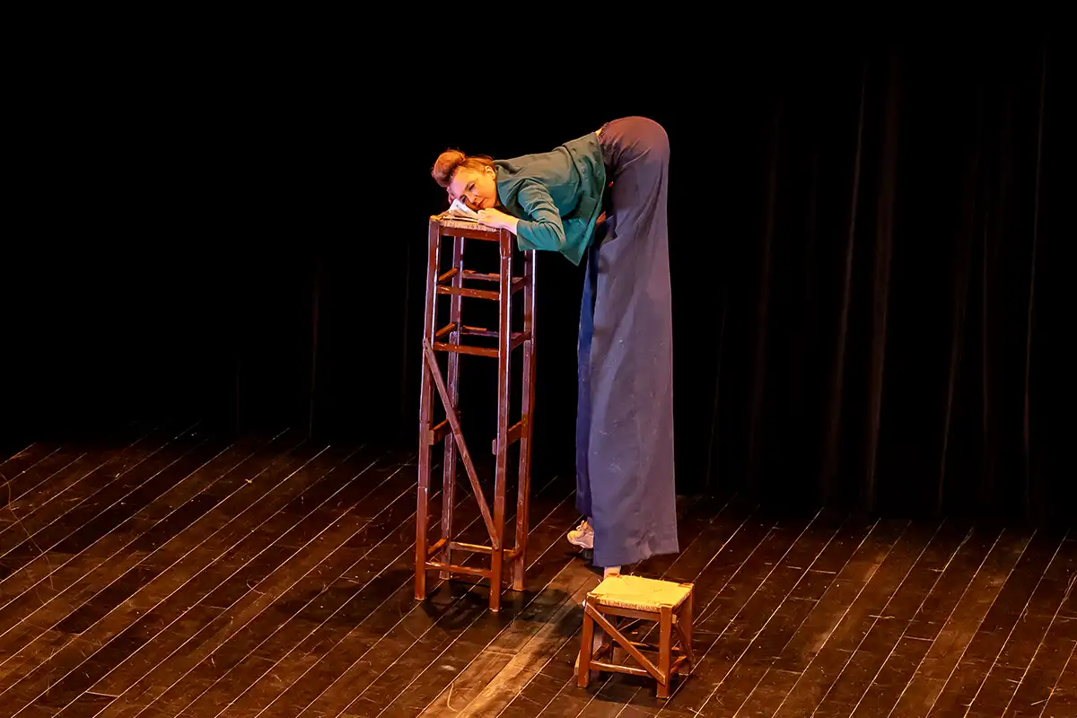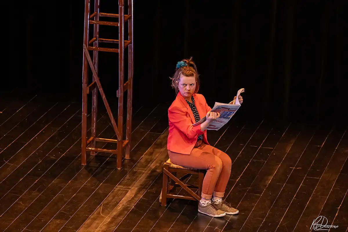 Comédienne du spectacle Si tu n’étais pas là lisant un journal sur scène à L’Esty