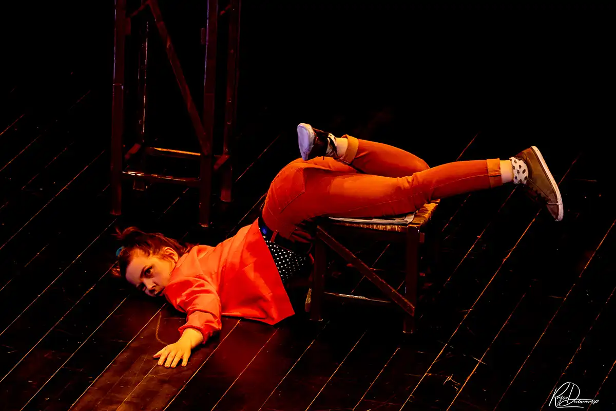 Comédienne du spectacle Si tu n’étais pas là en posture clownesque sur une petite chaise à L’Esty