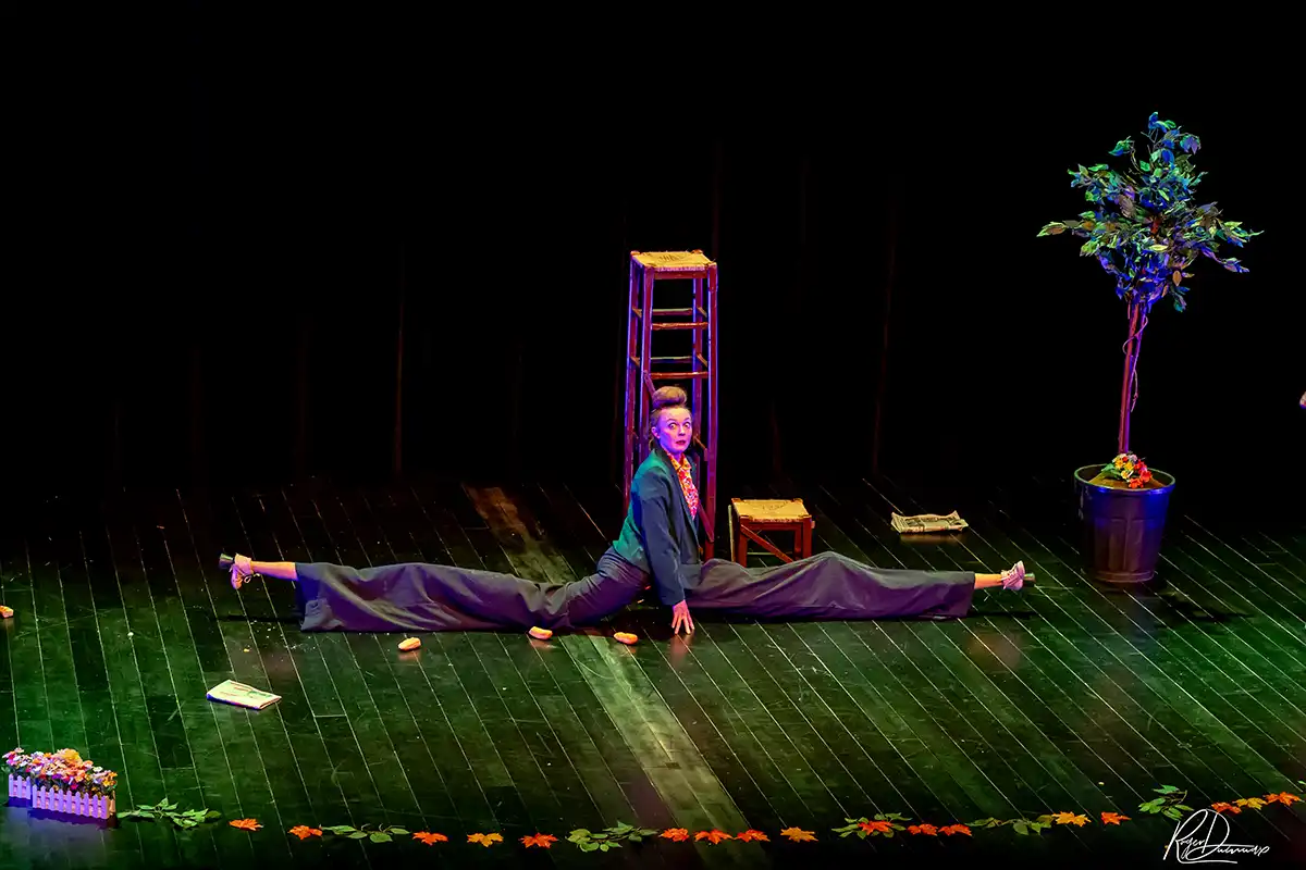 Artiste du spectacle Si tu n’étais pas là en grand écart sur la scène de L’Esty